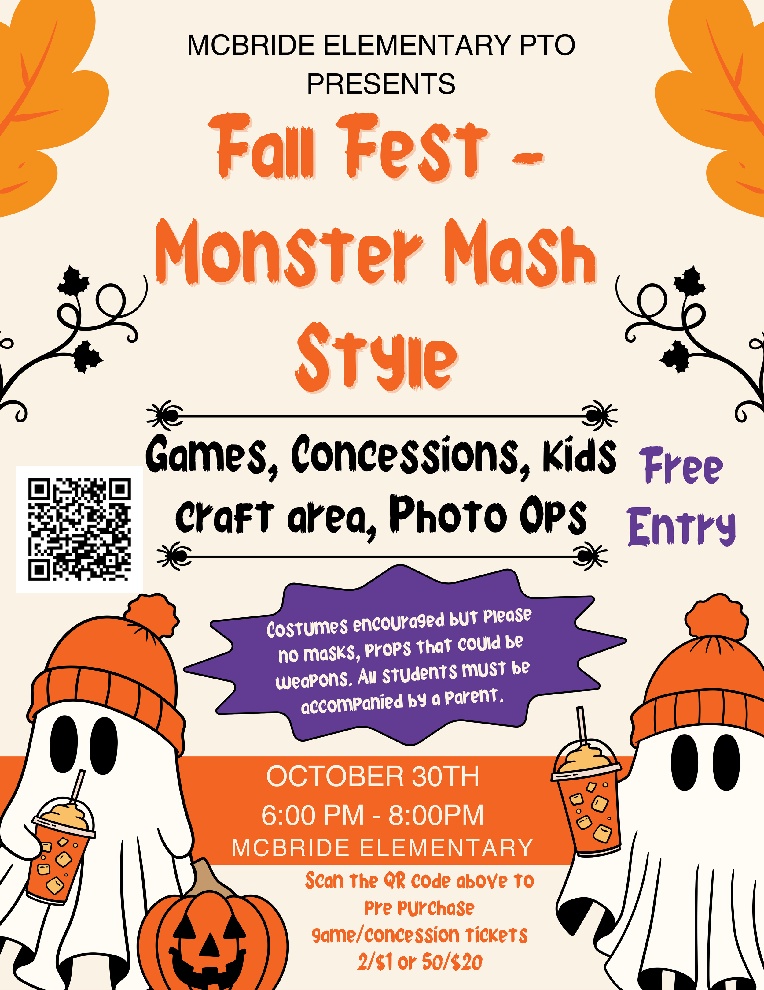 10/30/2025 at 6pm, please joing your McBride PTO for our Fall Fest, Monster Mash style.